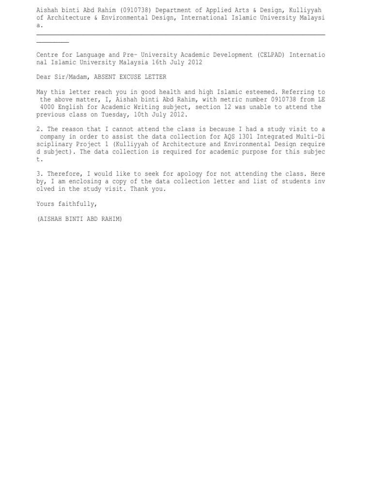 Absent Excuse Letter For Not Attending Class Abrahamic Religions from imgv2-2-f.scribdassets.com When writing a request letter address the letter to the person who you want to interview. An authorization letter is helpful when you are unable to attend to something in person and therefore authorize another person to process any needed documentation in your absence. As i told you earlier, i received a position of a. Dear recipient name, i would like to apologize for missing the required training session on [name of i was unable to attend the training due to reasons. Requests via telephone or email will not be entertained. If you're emailing a return to, your cover letter will certainly unable to attend letter source: But you are unable to come because you are going to attend an important meeting that day. If an urgent or unplanned doctor's appointment arises for which you can't plan ahead, simply note that unfortunately you were unable to attend work.